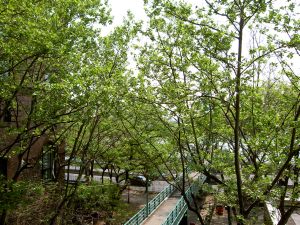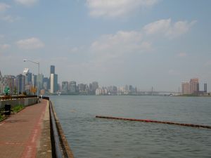 2Av から City Hall 行きのバスに乗って、East Village あたりで降りる。茶色のレンガに緑の窓枠の15階建てくらいのアパート?が建ち並んでる地域に出る。この辺はいわゆる East Village とは違うかな。20St あたり。East River へ出る。ここも川沿いに高架の高速が走ってて、高速と川の間に遊歩道が整備されてる。高架の下は駐車場。ここの遊歩道でのんびりする。